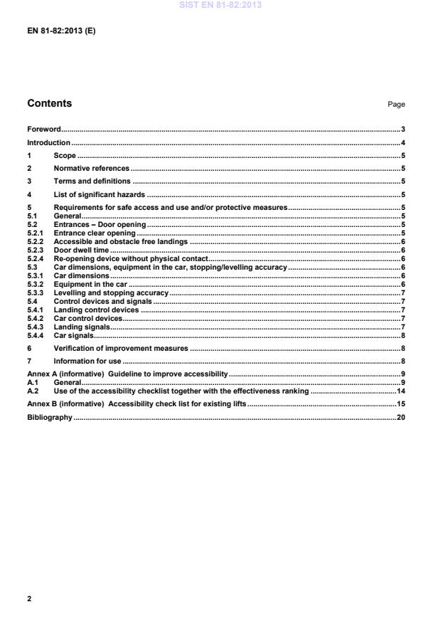 SIST EN 81-82:2013 is a standard published by the Slovenian Institute for Standardization (SIST). Its full title is "Safety rules for the construction and installation of lifts - Existing lifts - Part 82: Rules for the improvement of the accessibility of existing lifts for persons including persons with disability". This standard covers: 1.1 This European Standard provides rules on how to apply EN 81-70 referred to in EN 81-80:2003, 5.2.1 [4] to existing lifts to improve their accessibility for persons including persons with disability. 1.2 This European Standard applies to permanently installed lifts serving defined landing levels, having a car designed for the transportation of persons or persons and goods and moving between guide rails inclined not more than 15° to the vertical.