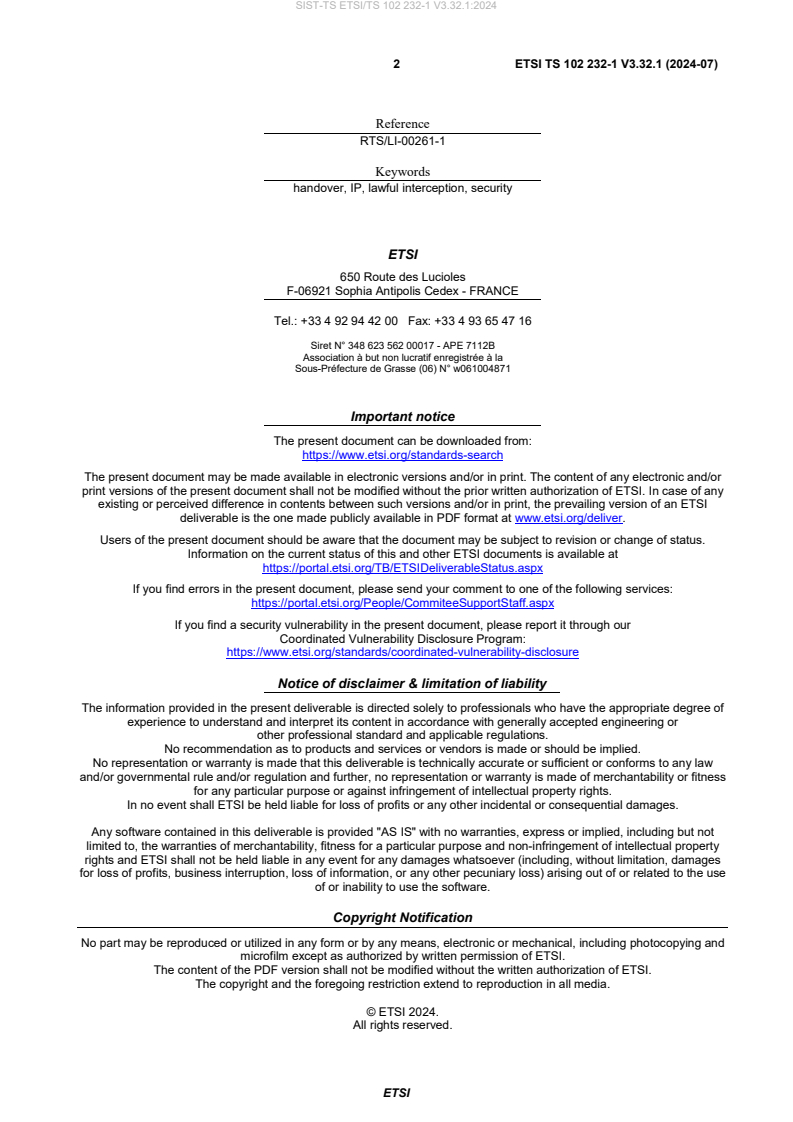 ETSI TS 102 232-1 V3.32.1 (2024-07) - Lawful Interception (LI); Handover Interface and Service-Specific Details (SSD) for IP delivery; Part 1: Handover specification for IP delivery