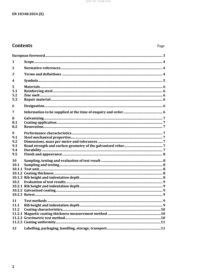 SIST EN 10348:2024 is a standard published by the Slovenian Institute for Standardization (SIST). Its full title is "Steel for the reinforcement of concrete - Galvanized reinforcing steel products". This standard covers: This document specifies requirements for hot dip galvanized reinforcing steel in the form of products which meet the requirements of EN 10080 and subjected, where appropriate, to further processing, e.g. bars, bent bars, stirrups, products straightened from coils, products cut from bars, welded structures and any other components fabricated for use in the reinforcement of concrete. This document does not apply to hot dip galvanized reinforcement for prestressing or components of these reinforcements.
