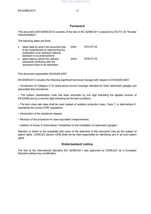SIST EN 62598:2013 is a standard published by the Slovenian Institute for Standardization (SIST). Its full title is "Nuclear instrumentation - Constructional requirements and classification of radiometric gauges". This standard covers: IEC 62598:2011 applies to the manufacture and installation of electrical measuring systems and instruments utilizing radioactive sources (radiometric gauges, hereinafter called gauges). It also applies to source housings intended for use in the aforementioned measuring systems. This standard applies to equipment, which is not related to power production or to the fuel cycle. It specifies constructional requirements for the design of instruments utilizing radioactive sources in regard of radiation protection. This standards cancels and replaces IEC 60405.