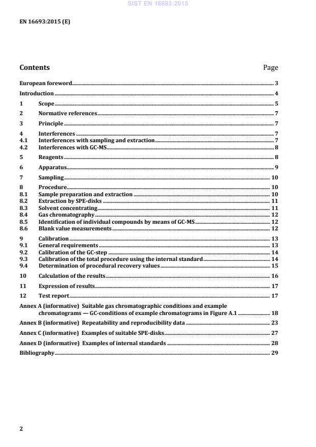 SIST EN 16693:2015 is a standard published by the Slovenian Institute for Standardization (SIST). Its full title is "Water quality - Determination of organochlorine pesticides (OCP) in whole water samples using solid phase extraction (SPE) with SPE-disks combined with gas chromatography mass spectrometry (GC-MS)". This standard covers: This European Standard specifies a method for the determination of selected organochlorine pesticides (OCP, see Table 1), in water samples. The method uses solid-phase extraction with SPE-disks followed by gas chromatography-mass spectrometry (GC-MS). It is applicable to the analysis of OCPs in surface water containing suspended particulate matter (SPM) up to 500 mg/l (whole water samples), drinking water and groundwater. The lower limit of the working range depends on the matrix, on the specific compound to be analyzed and on the sensitivity of the mass spectrometric detection unit. For compounds listed in Table 1 the limit of determination (LOQ) it is at least 30 % of the corresponding AA-EQS value (0,000 15 µg/l to 0,1 µg/l) according to the requirements of the European EQS Directive 2008/105/EC for both inland surface waters and other surface waters. This method may be used for the analysis of other OCPs not listed in Table 1 or other types of water. However, it is necessary to verify its applicability before use. (...)