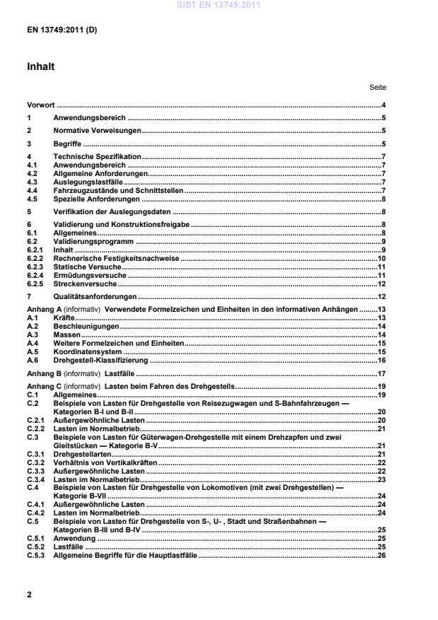 Lasten beim Fahren des Drehgestells.19 C.1 Allgemeines.19 C.2 Beispiele von Lasten für Drehgestelle von Reisezugwagen und S-Bahnfahrzeugen — Kategorien B-I und B-II.20 C.2.1 Außergewöhnliche Lasten.20 C.2.2 Lasten im Normalbetrieb.21 C.3 Beispiele von Lasten für Güterwagen-Drehgestelle mit einem Drehzapfen und zwei Gleitstücken — Kategorie B-V.21 C.3.1 Drehgestellarten.21 C.3.2 Verhältnis von Vertikalkräften.22 C.3.3 Außergewöhnliche Lasten.22 C.3.4 Lasten im Normalbetrieb.23 C.4 Beispiele von Lasten für Drehgestelle von Lokomotiven (mit zwei Drehgestellen) — Kategorie B-VII.24 C.4.1 Außergewöhnliche Lasten.24 C.4.2 Lasten im Normalbetrieb.24 C.5 Beispiele von Lasten für Drehgestelle von S-, U- , Stadt und Straßenbahnen — Kategorien B-III und B-IV.25 C.5.1 Anwendung.25 C.5.2 Lastfälle.25 C.5.3 Allgemeine Begriffe für die Hauptlastfälle.26 SIST EN 13749:2011