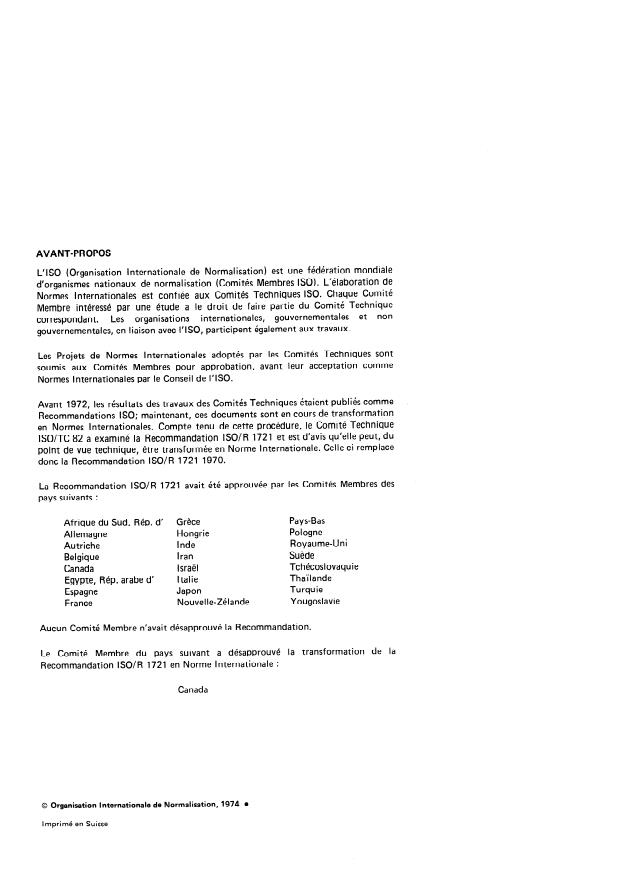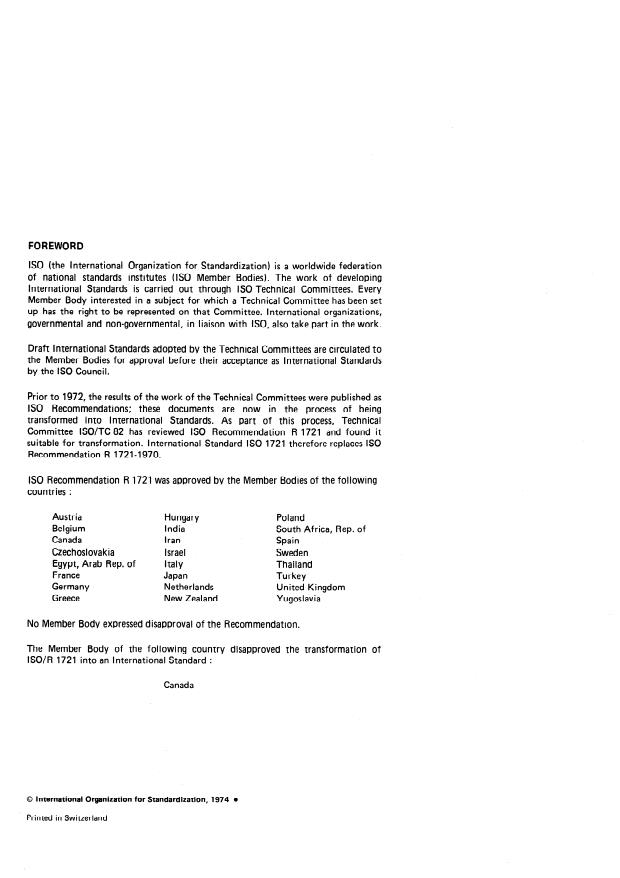 IS0 Recommendation R 1721 was approved by the Member Bodies of the following