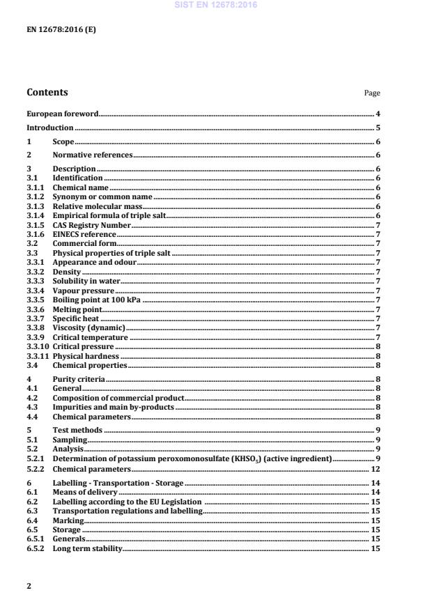 (1) is: + 1,82 V at 25°C 4 Purity criteria 4.1 General This European Standard specifies the minimum purity requirements for potassium peroxomonosulfate used for the treatment of water intended for human consumption. Limits are given for impurities commonly present in the product. Depending on the raw material and the manufacturing process other impurities may be present and, if so, this shall be notified to the user and when necessary to the relevant authorities. Users of this product should check the national regulations in order to clarify whether it is of appropriate purity for treatment of water intended for human consumption, taking into account raw water quality, required dosage, contents of other impurities and additives used in the product not stated in the product standard. Limits have been given for impurities and chemicals parameters where these are likely to be present in significant quantities from the current production process and raw materials. If the production process or raw materials leads to significant quantities of impurities, by-products or additives being present, this shall be notified to the user. 4.2 Composition of commercial product The commercial product shall contain KHSO5 (potassium peroxomonosulfate) at a mass fraction greater than 45 percent or the manufacturer’s declared values. Typical composition in mass fraction should be approximately: 45 % potassium peroxsomonosulfate (KHSO5), 25 % potassium hydrogen sulfate (KHSO4), and 30 % potassium sulfate (K2SO4). 4.3 Impurities and main by-products See 4.1. 4.4 Chemical parameters NOTE For the purpose of this European Standard, “chemical parameters” are those defined in the EU Directive 98/83/EC of 3 November 1998 (see [2]). The content of chemical parameters shall conform to the requirements specified in Table 1. SIST EN 12678:2016