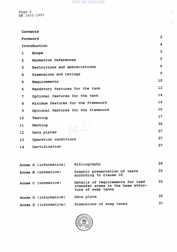 SIST EN 1432:2000 is a standard published by the Slovenian Institute for Standardization (SIST). Its full title is "Swap bodies - Swap tanks - Dimensions, requirements, test methods, operation conditions". This standard covers: This European standard specifies the main dimensional and design characteristics, ratings, test methods, and operational requirements of swap tanks to be used within domestic and international multimodal traffic by road, rail, short sea, inland waterways, Ro/Ro or ferry transport. Swap tanks are not intended for intercontinental deep-sea traffic.