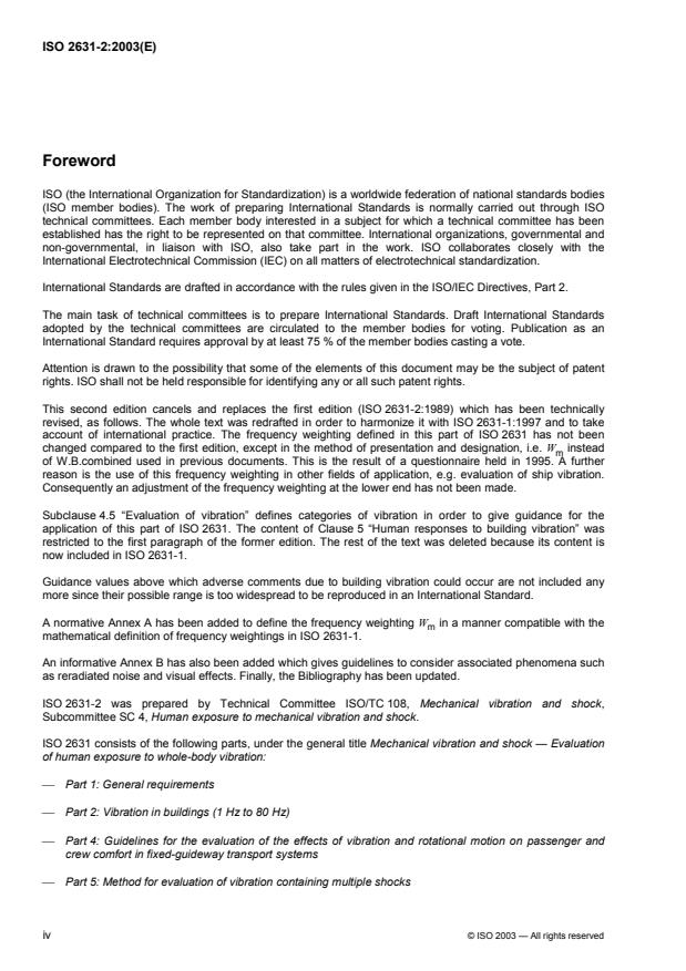 ISO 2631-2:2003 concerns human exposure to whole-body vibration and shock in buildings with respect to the comfort and annoyance of the occupants. It specifies a method for measurement and evaluation, comprising the determination of the measurement direction and measurement location. It defines the frequency weighting Wm which is applicable in the frequency range 1 Hz to 80 Hz where the posture of an occupant does not need to be defined. Whilst it is often the case that a building will be available for experimental investigation, many of the concepts contained within ISO 2631-2 would apply equally to a building in the design process or where it will not be possible to gain access to an existing building. In these cases, reliance will have to be placed on the prediction of the building response by some means. ISO 2631-2 does not provide guidance on the likelihood of structural damage, which is discussed in ISO 4866. Further, it is not applicable to the evaluation of effects on human health and safety. Acceptable magnitudes of vibration are not stated in ISO 2631-2. The mathematical definition of the frequency weighting Wm is given in Annex A. Guidelines for collecting data concerning complaints about building vibration are given in Annex B.