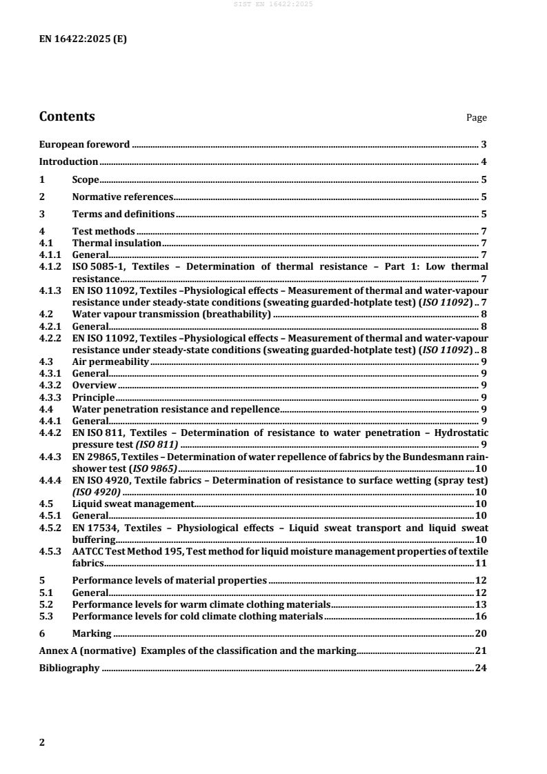 Keywords: EN 16422:2025, thermoregulatory properties, textile testing, thermal insulation, breathability, water vapour resistance, air permeability, water repellence, liquid sweat management, CEN.