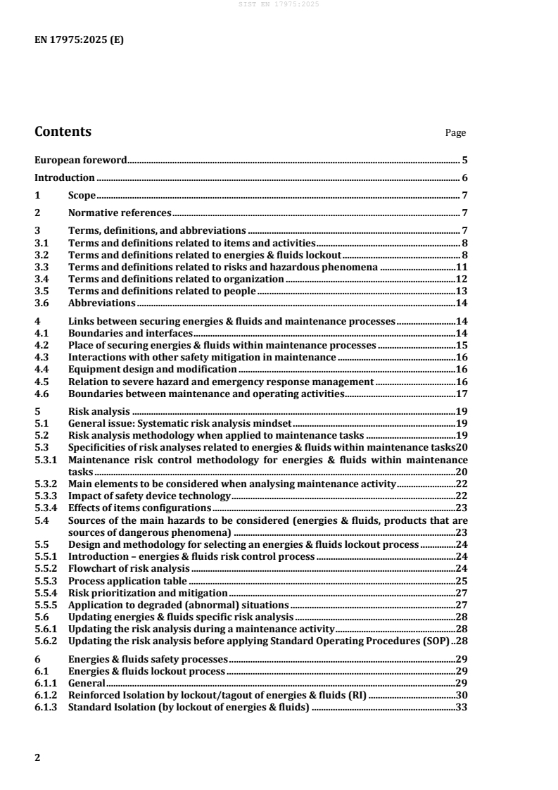 Keywords: SIST EN 17975:2025, energies and fluids, lockout/tagout, LOTO, maintenance safety, safe isolation, risk control, maintenance standards, occupational safety.