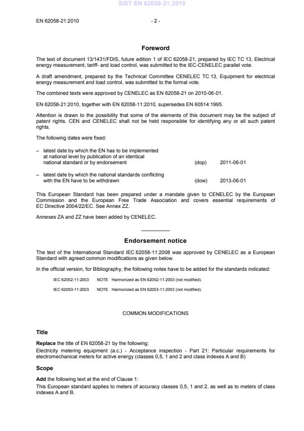 EN 62058-21:2010 - Electricity metering equipment (a.c.) - Acceptance inspection - Part 21 - specifies particular requirements for the acceptance inspection of newly manufactured electromechanical meters for active energy (accuracy classes 0,5, 1 and 2 and class indexes A and B). It is a CENELEC-adopted version of IEC 62058-21:2008 (with agreed modifications) and applies primarily to lots delivered in quantities above 50 (smaller-lot arrangements are by agreement between manufacturer and customer). The standard supports conformity assessment under the Measuring Instruments Directive (MID).