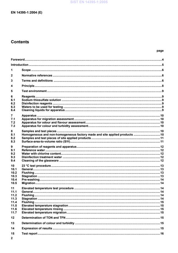 Keywords: EN 14395-1:2004, organoleptic assessment, water intended for human consumption, storage systems, odour, flavour, TON, TFN, colour, turbidity, migration test, disinfection pretreatment.