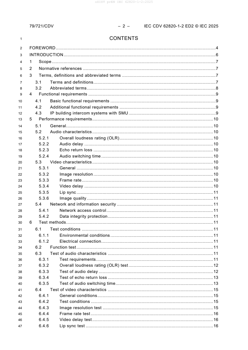 prEN IEC 62820-1-2:2025 - Building intercom systems - Part 1-2: System requirements - Building intercom systems using the internet protocol (IP) - specifies the technical composition, functional and performance requirements, and test methods for IP-based building intercom systems (BIS). It is a supplement to IEC 62820-1-1 (General) and applies to both residential and commercial buildings. Mixed IP/non‑IP systems are excluded (those are covered by IEC 62820-1-1).