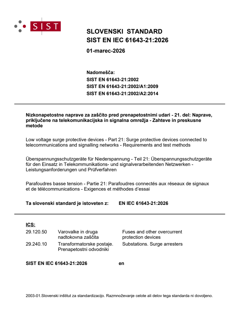 SIST EN IEC 61643-21:2026 is a standard published by the Slovenian Institute for Standardization (SIST). Its full title is "Low voltage surge protective devices - Part 21: Surge protective devices connected to telecommunications and signalling networks - Requirements and test methods". This standard covers: IEC 61643-21:2025 is applicable to devices for surge protection against indirect and direct effects of lightning or other transient overvoltages. These devices are intended to be connected to telecommunications and signalling networks, and equipment rated up to 1 000 V RMS and 1 500 V DC. These telecommunications and signalling networks can also provide power on the same line, e.g. Power over Ethernet (PoE). Performance and safety requirements, tests and ratings are specified in this document. These devices contain at least one voltage-limiting component (clamping or switching) and are intended to limit surge voltages and divert surge currents. This second edition cancels and replaces the first edition published in 2000, Amendment1:2008 and Amendment 2:2012. This edition constitutes a technical revision. This edition includes the following significant technical changes with respect to the previous edition: a) New structure of IEC 61643-21 based on IEC 61643-01:2024; b) Several safety requirements based on IEC 61643-01:2024 have been added. This International Standard is to be used in conjunction with IEC 61643-01:2024.