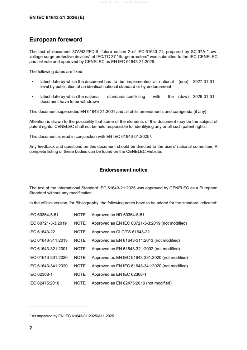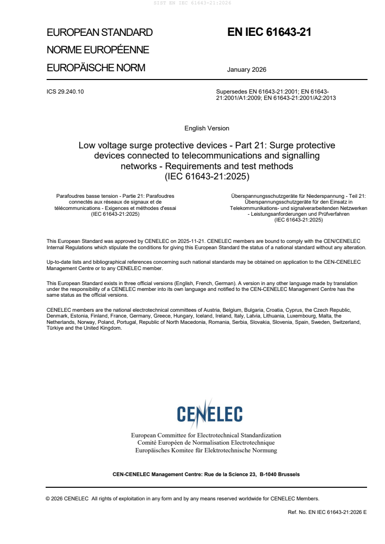 EN IEC 61643-21:2026 - Low voltage surge protective devices (SPDs) - Part 21 specifies requirements and test methods for SPDs intended for connection to telecommunications and signalling networks. It covers devices designed to protect equipment rated up to 1 000 V RMS and 1 500 V DC from indirect and direct lightning and other transient overvoltages. Devices may also carry power on the same line (e.g., Power over Ethernet, PoE). This second edition is a technical revision that adopts a new structure and additional safety requirements based on IEC 61643-01:2024 and is to be used in conjunction with that document.