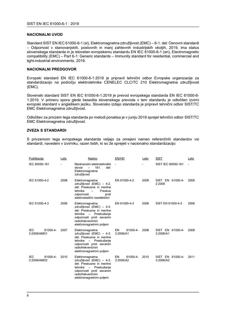 SIST EN IEC 61000-6-1:2019 is a standard published by the Slovenian Institute for Standardization (SIST). Its full title is "Electromagnetic compatibility (EMC) Part 6-1: Generic standards - Immunity standard for residential, commercial and light-industrial environments". This standard covers: Applies to electrical and electronic apparatus intended for use in residential, commercial and light-industrial environments. Immunity requirements in the frequency range 0 Hz to 400 GHz are covered. No tests need to be performed at frequencies where no requirements are specified. This generic EMC immunity standard is applicable if no relevant dedicated product or product-family EMC immunity standard exists. This standard applies to apparatus intended to be directly connected to a low-voltage public mains network or connected to a dedicated DC source which is intended to interface between the apparatus and the low-voltage public mains network. This standard applies also to apparatus which is battery operated or is powered by a non-public, but non-industrial, low-voltage power distribution system if this apparatus is intended to be used in the locations described below. The environments encompassed by this standard are residential, commercial and light-industrial locations, both indoor and outdoor. The following list, although not comprehensive, gives an indication of locations which are included: - residential properties, for example houses, apartments; - retail outlets, for example shops, supermarkets; - business premises, for example offices, banks; - areas of public entertainment, for example cinemas, public bars, dance halls; - outdoor locations, for example petrol stations, car parks, amusement and sports centres; - light-industrial locations, for example workshops, laboratories, service centres. Locations which are characterised by being supplied directly at low voltage from the public mains network are considered to be residential, commercial or light-industrial. The immunity requirements have been selected to ensure an adequate level of immunity for apparatus at residential, commercial and light-industrial locations. The levels do not, however, cover extreme cases, which may occur at any location, but with an extremely low probability of occurrenc