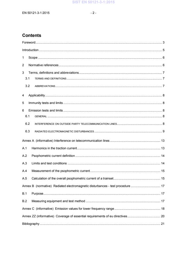 SIST EN 50121-3-1:2015 is a standard published by the Slovenian Institute for Standardization (SIST). Its full title is "Railway applications - Electromagnetic compatibility - Part 3-1: Rolling stock - Train and complete vehicle". This standard covers: This European Standard specifies the emission and immunity requirements for all types of rolling stock. It covers traction stock, hauled stock and trainsets including urban vehicles for use in city streets. The frequency range considered is from 0 Hz (DC) to 400 GHz. No measurements need to be performed at frequencies where no requirement is specified. The scope of this part of the standard ends at the interface of the rolling stock with its respective energy inputs and outputs. In the case of locomotives, trainsets, trams etc., this is the current collector (pantograph, shoe gear). In the case of hauled stock, this is the AC or DC auxiliary power connector. However, since the current collector is part of the traction stock, it is not entirely possible to exclude the effects of this interface with the power supply line. The slow moving test has been designed to minimize these effects. This European standard specifies the emission limits of the rolling stock to the outside world. There may be additional compatibility requirements within the railway system identified in the EMC plan (e.g. as specified in EN 50238). Basically, all apparatus to be integrated into a vehicle shall meet the requirements of Part 3-2 of this standard. In exceptional cases, where apparatus meets another EMC Standard, but full compliance with Part 3-2 is not demonstrated, EMC shall be ensured by adequate integration measures of the apparatus into the vehicle system and/or by an appropriate EMC analysis and test which justifies deviating from Part 3-2. The electromagnetic interference concerning the railway system as a whole is dealt with in EN 50121 2. These specific provisions are to be used in conjunction with the general provisions in EN 50121 1.