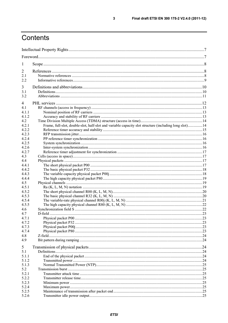 ETSI ETSI EN 300 175-2 V2.4.1 (2012-04) 3 Contents Intellectual Property Rights . 7 Foreword . 7 1 Scope . 8 2 References . 8 2.1 Normative references . 8 2.2 Informative references . 9 3 Definitions and abbreviations . 10 3.1 Definitions . 10 3.2 Abbreviations . 11 4 PHL services . 12 4.1 RF channels (access in frequency) . 13 4.1.1 Nominal position of RF carriers . 13 4.1.2 Accuracy and stability of RF carriers . 13 4.2 Time Division Multiple Access (TDMA) structure (access in time) . 14 4.2.1 Frame, full-slot, double-slot, half-slot and variable capacity slot structure (including long slot) . 14 4.2.2 Reference timer accuracy and stability . 15 4.2.3 RFP transmission jitter. 16 4.2.4 PP reference timer synchronization . 16 4.2.5 System synchronization . 16 4.2.6 Inter-system synchronization . 16 4.2.7 Reference timer adjustment for synchronization . 17 4.3 Cells (access in space) . 17 4.4 Physical packets . 17 4.4.1 The short physical packet P00 . 17 4.4.2 The basic physical packet P32 . 18 4.4.3 The variable capacity physical packet P00j . 18 4.4.4 The high capacity physical packet P80 . 19 4.5 Physical channels . 19 4.5.1 Ra (K, L, M, N) notation . 19 4.5.2 The short physical channel R00 (K, L, M, N) . 20 4.5.3 The basic physical channel R32 (K, L, M, N) . 20 4.5.4 The variable-rate physical channel R00j (K, L, M, N) . 21 4.5.5 The high capacity physical channel R80 (K, L, M, N) . 22 4.6 Synchronization field S . 22 4.7 D-field . 23 4.7.1 Physical packet P00 . 23 4.7.2 Physical packet P32 . 23 4.7.3 Physical packet P00j . 23 4.7.4 Physical packet P80 . 23 4.8 Z-field . 24 4.9 Bit pattern during ramping . 24 5 Transmission of physical packets . 24 5.1 Definitions . 24 5.1.1 End of the physical packet . 24 5.1.2 Transmitted power . 24 5.1.3 Normal Transmitted Power (NTP) . 25 5.2 Transmission burst . 25 5.2.1 Transmitter attack time . 25 5.2.2 Transmitter release time . 25 5.2.3 Minimum power . 25 5.2.4 Maximum power . 25 5.2.5 Maintenance of transmission after packet end . 25 5.2.6 Transmitter idle power output . 25 SIST EN 300 175-2 V2.4.1:2012