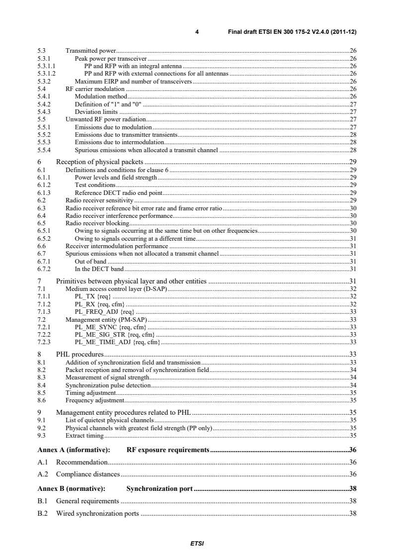 ETSI ETSI EN 300 175-2 V2.4.1 (2012-04) 4 5.3 Transmitted power . 26 5.3.1 Peak power per transceiver . 26 5.3.1.1 PP and RFP with an integral antenna . 26 5.3.1.2 PP and RFP with external connections for all antennas . 26 5.3.2 Maximum EIRP and number of transceivers . 26 5.4 RF carrier modulation . 26 5.4.1 Modulation method . 26 5.4.2 Definition of "1" and "0" . 27 5.4.3 Deviation limits . 27 5.5 Unwanted RF power radiation . 27 5.5.1 Emissions due to modulation . 27 5.5.2 Emissions due to transmitter transients . 28 5.5.3 Emissions due to intermodulation . 28 5.5.4 Spurious emissions when allocated a transmit channel . 28 6 Reception of physical packets . 29 6.1 Definitions and conditions for clause 6 . 29 6.1.1 Power levels and field strength . 29 6.1.2 Test conditions . 29 6.1.3 Reference DECT radio end point . 29 6.2 Radio receiver sensitivity . 29 6.3 Radio receiver reference bit error rate and frame error ratio . 30 6.4 Radio receiver interference performance. 30 6.5 Radio receiver blocking . 30 6.5.1 Owing to signals occurring at the same time but on other frequencies . 30 6.5.2 Owing to signals occurring at a different time . 31 6.6 Receiver intermodulation performance . 31 6.7 Spurious emissions when not allocated a transmit channel . 31 6.7.1 Out of band . 31 6.7.2 In the DECT band . 31 7 Primitives between physical layer and other entities . 31 7.1 Medium access control layer (D-SAP) . 32 7.1.1 PL_TX {req} . 32 7.1.2 PL_RX {req, cfm} . 32 7.1.3 PL_FREQ_ADJ {req} . 33 7.2 Management entity (PM-SAP) . 33 7.2.1 PL_ME_SYNC {req, cfm} . 33 7.2.2 PL_ME_SIG_STR {req, cfm} . 33 7.2.3 PL_ME_TIME_ADJ {req, cfm} . 33 8 PHL procedures . 33 8.1 Addition of synchronization field and transmission . 33 8.2 Packet reception and removal of synchronization field . 34 8.3 Measurement of signal strength . 34 8.4 Synchronization pulse detection . 34 8.5 Timing adjustment . 35 8.6 Frequency adjustment . 35 9 Management entity procedures related to PHL . 35 9.1 List of quietest physical channels . 35 9.2 Physical channels with greatest field strength (PP only) . 35 9.3 Extract timing . 35 Annex A (informative): RF exposure requirements . 36 A.1 Recommendation . 36 A.2 Compliance distances . 36 Annex B (normative): Synchronization port . 38 B.1 General requirements . 38 B.2 Wired synchronization ports . 38 SIST EN 300 175-2 V2.4.1:2012