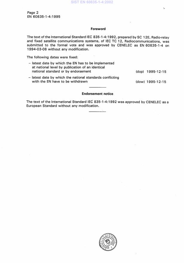 SIST EN 60835-1-4:2002 is classified under the following ICS (International Classification for Standards) categories: 33.060.30 - Radio relay and fixed satellite communications systems. The ICS classification helps identify the subject area and facilitates finding related standards.