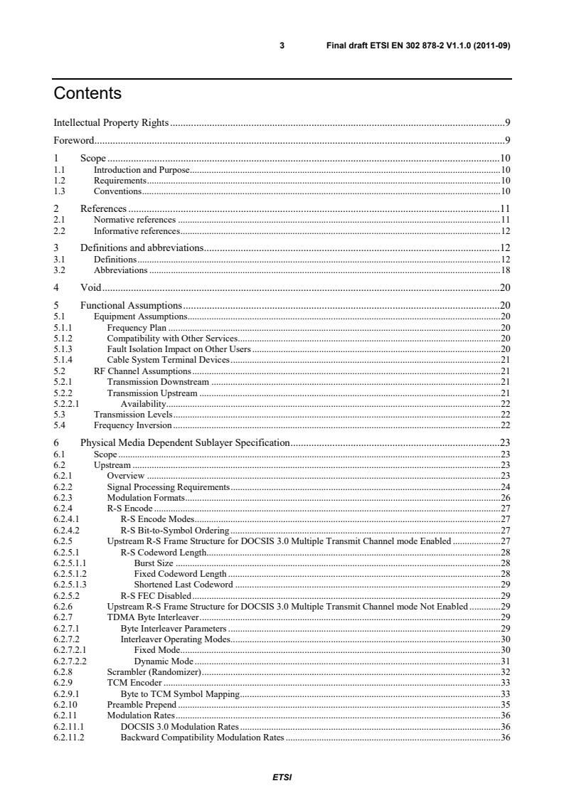 ETSI ETSI EN 302 878-2 V1.1.1 (2011-11) 5 6.3.2 Downstream Electrical Input to CM . 87 6.3.3 CM BER Performance . 87 6.3.3.1 64-QAM . 88 6.3.3.1.1 64-QAM CM BER Performance . 88 6.3.3.1.2 Image Rejection Performance . 88 6.3.3.1.3 64-QAM Adjacent Channel Performance. 88 6.3.3.2 256-QAM . 88 6.3.3.2.1 256-QAM CM BER Performance . 88 6.3.3.2.2 256-QAM Image Rejection Performance . 88 6.3.3.2.3 256-QAM Adjacent Channel Performance. 89 6.3.4 Downstream Multiple Receiver Capabilities . 89 6.3.4.1 Receive Module Parameters . 89 6.3.4.2 Receive Channel Parameters . 90 6.3.4.3 Standard Receive Channel Profile . 90 6.3.4.4 Example Manufacturer Receive Channel Profile . 91 6.3.4.5 Reconfiguration of CM Receive Channels . 92 6.3.5 Non-Synchronous DS Channel Support . 92 Annex A (normative): Timing Requirements for Supporting Business Services over DOCSIS . 93 A.1 CMTS . 93 A.2 CM . 93 Annex B (normative): Additions and Modifications for European Specification . 94 B.1 Scope . 94 B.1.1 Introduction and Purpose . 94 B.1.2 Background . 94 B.1.2.1 Broadband Access Network . 94 B.1.2.2 Network and System Architecture . 94 B.1.2.2.1 The DOCSIS Network . 94 B.1.2.3 Service Goals . 95 B.1.2.4 Statement of Compatibility . 95 B.1.2.5 Reference Architecture . 95 B.1.2.6 Void . 95 B.1.3 Requirements . 95 B.1.4 Conventions . 95 B.1.5 Void . 95 B.2 References . 95 B.2.1 Normative References . 95 B.2.2 Informative References . 95 B.2.3 Reference Acquisition . 95 B.3 Terms and Definitions . 95 B.4 Abbreviations and Acronyms . 96 B.5 Functional Assumptions . 96 B.5.1 Equipment Assumptions . 96 B.5.1.1 Frequency Plan . 96 B.5.1.2 Compatibility with Other Services . 96 B.5.1.3 Fault Isolation Impact on Other Users . 96 B.5.1.4 Cable System Terminal Devices . 96 B.5.2 RF Channel Assumptions . 96 B.5.2.1 Transmission Downstream . 97 B.5.2.2 Transmission Upstream . 98 B.5.2.2.1 Availability. 98 B.5.3 Transmission Levels . 98 B.5.4 Frequency Inversion . 98 B.6 Physical Media Dependent Sublayer Specification . 98 B.6.1 Scope . 98 SIST EN 302 878-2 V1.1.1:2012