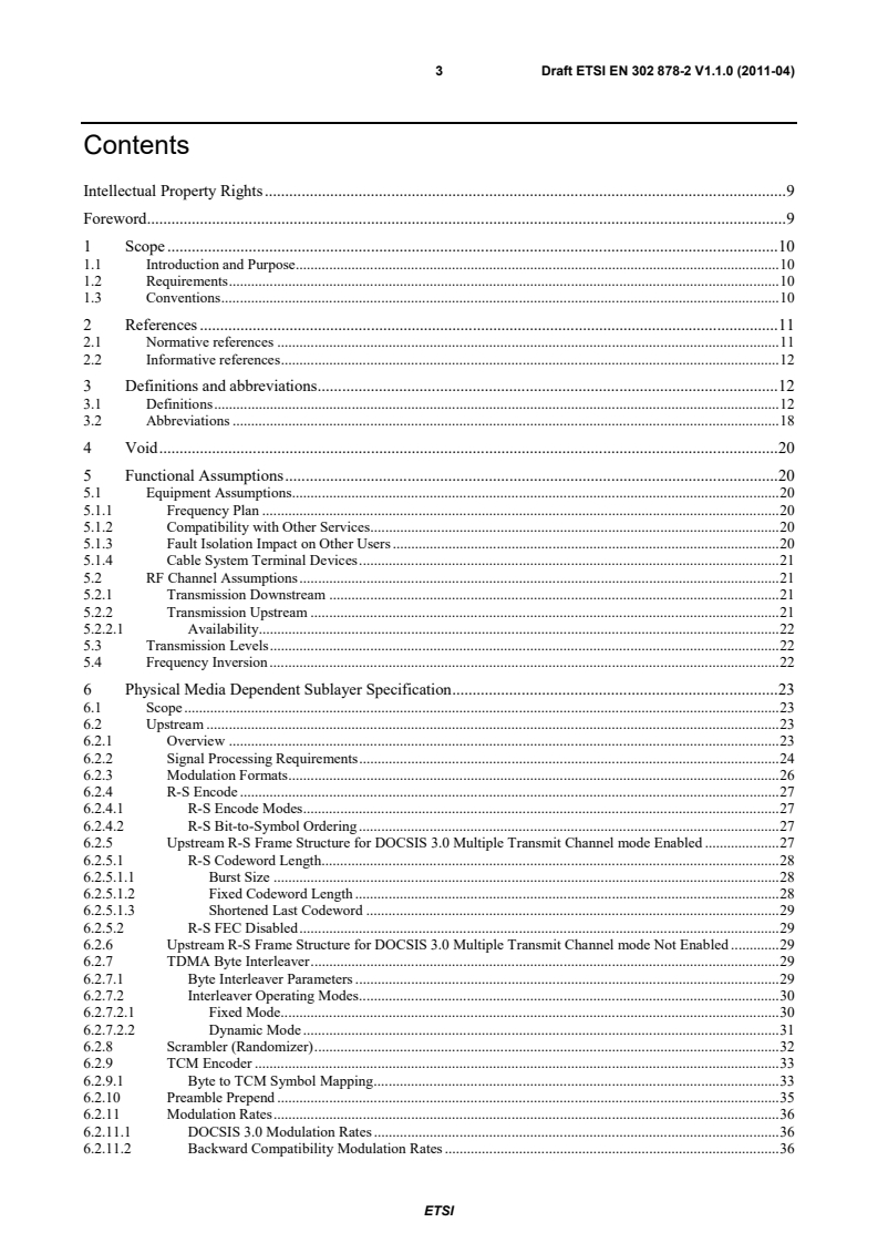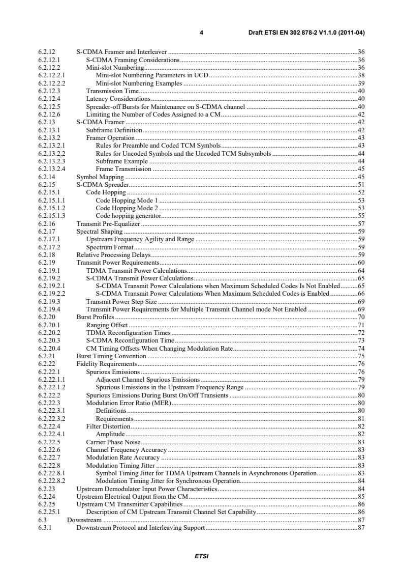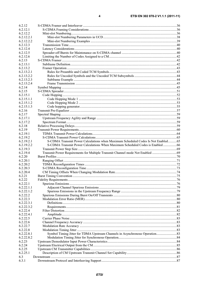 ETSI ETSI EN 302 878-2 V1.1.1 (2011-11) 7 B.6.2.20.2 TDMA Reconfiguration Times . 116 B.6.2.20.3 S-CDMA Reconfiguration Times . 118 B.6.2.20.4 CM Timing Offsets When Changing Modulation Rate. 118 B.6.2.21 Burst Timing Convention . 118 B.6.2.22 Fidelity Requirements . 118 B.6.2.22.1 Spurious Emissions . 118 B.6.2.22.1.1 Adjacent Channel Spurious Emissions . 120 B.6.2.22.1.2 Spurious Emissions in the Upstream Frequency Range . 121 B.6.2.22.2 Spurious Emissions During Burst On/Off Transients . 121 B.6.2.22.3 Modulation Error Ratio (MER) . 121 B.6.2.22.3.1 Definitions . 122 B.6.2.22.3.2 Requirements . 122 B.6.2.22.4 Filter Distortion . 122 B.6.2.22.4.1 Amplitude . 123 B.6.2.22.5 Carrier Phase Noise . 123 B.6.2.22.6 Channel Frequency Accuracy . 123 B.6.2.22.7 Modulation Rate Accuracy . 123 B.6.2.22.8 Modulation Timing Jitter . 123 B.6.2.22.8.1 Symbol Timing Jitter for TDMA Upstream Channels in Asynchronous Operation . 123 B.6.2.22.8.2 Modulation Timing Jitter for Synchronous Operation . 123 B.6.2.23 Upstream Demodulator Input Power Characteristics . 123 B.6.2.24 Upstream Electrical Output from the CM . 123 B.6.2.25 Upstream CM Transmitter Capabilities . 124 B.6.2.25.1 Description of CM Upstream Transmit Channel Set Capabilities. 124 B.6.3 Downstream . 124 B.6.3.1 Downstream Protocol and Interleaving Support . 124 B.6.3.2 Downstream Electrical Input to CM . 125 B.6.3.3 CM BER Performance . 125 B.6.3.3.1 64-QAM . 125 B.6.3.3.1.1 64-QAM CM BER Performance . 125 B.6.3.3.1.2 64-QAM Image Rejection Performance . 126 B.6.3.3.1.3 64-QAM Adjacent Channel Performance. 126 B.6.3.3.2 256-QAM . 126 B.6.3.3.2.1 256-QAM CM BER Performance . 126 B.6.3.3.2.2 256-QAM Image Rejection Performance . 126 B.6.3.3.2.3 256-QAM Adjacent Channel Performance. 126 B.6.3.4 Downstream Multiple Receiver Capabilities . 126 B.6.3.4.1 Receive Module Parameters . 126 B.6.3.4.2 Receive Channel Parameters . 127 B.6.3.4.3 Standard Receive Channel Profile . 127 B.6.3.4.4 Example Manufacturer Receive Channel Profile . 127 B.6.3.4.5 Reconfiguration of CM Receive Channels . 128 B.6.3.5 Non-Synchronous DS Channel Support . 128 Annex C (normative): MPEG Header Synchronizati