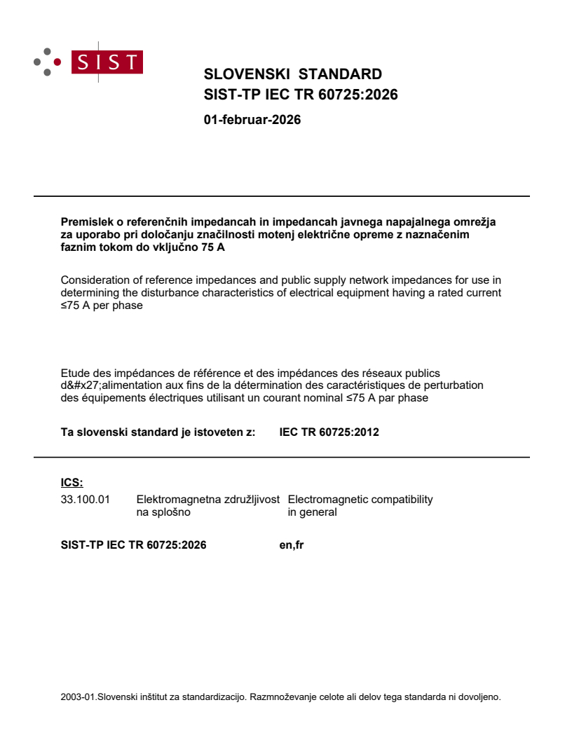SIST-TP IEC TR 60725:2026 is a technical report published by the Slovenian Institute for Standardization (SIST). Its full title is "Consideration of reference impedances and public supply network impedances for use in determining the disturbance characteristics of electrical equipment having a rated current ≤75 A per phase". This standard covers: IEC;TR 60725:2012, which is a technical report, records the information that was available and the factors that were taken into account in arriving at the reference impedances that were incorporated in IEC 60555 and which are now incorporated in some parts of IEC 61000-3. In addition, information is given on the impedances of public supply networks associated with service current capacities =100 A per phase. The third edition includes brings two mainly significant technical changes with respect to the previous edition: - a new survey and other data from countries with public supply networks operating at 60 Hz have been included; and - recommendations that were applicable to 50 Hz systems are now mirrored by new recommendations that are relevant to 60 Hz systems.