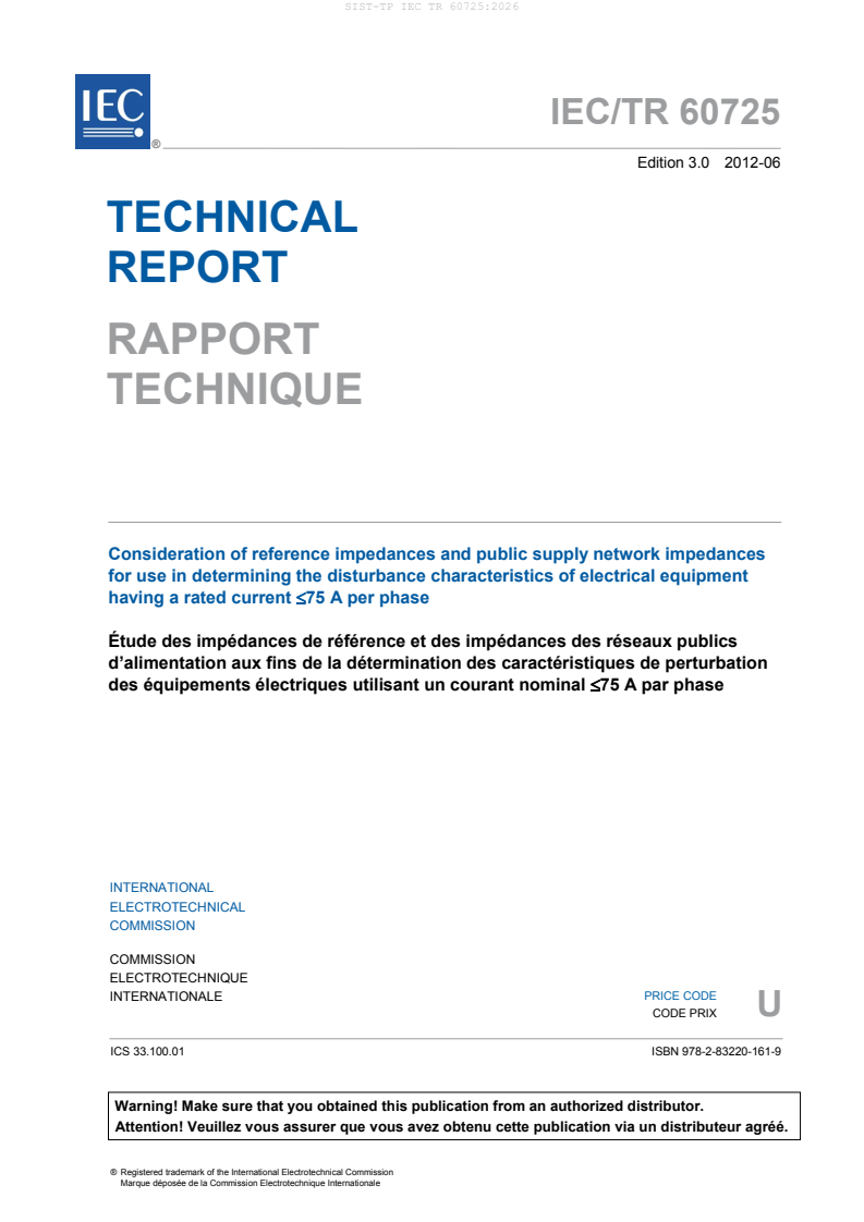 IEC;TR 60725:2012, which is a technical report, records the information that was available and the factors that were taken into account in arriving at the reference impedances that were incorporated in IEC 60555 and which are now incorporated in some parts of IEC 61000-3. In addition, information is given on the impedances of public supply networks associated with service current capacities =100 A per phase. The third edition includes brings two mainly significant technical changes with respect to the previous edition: