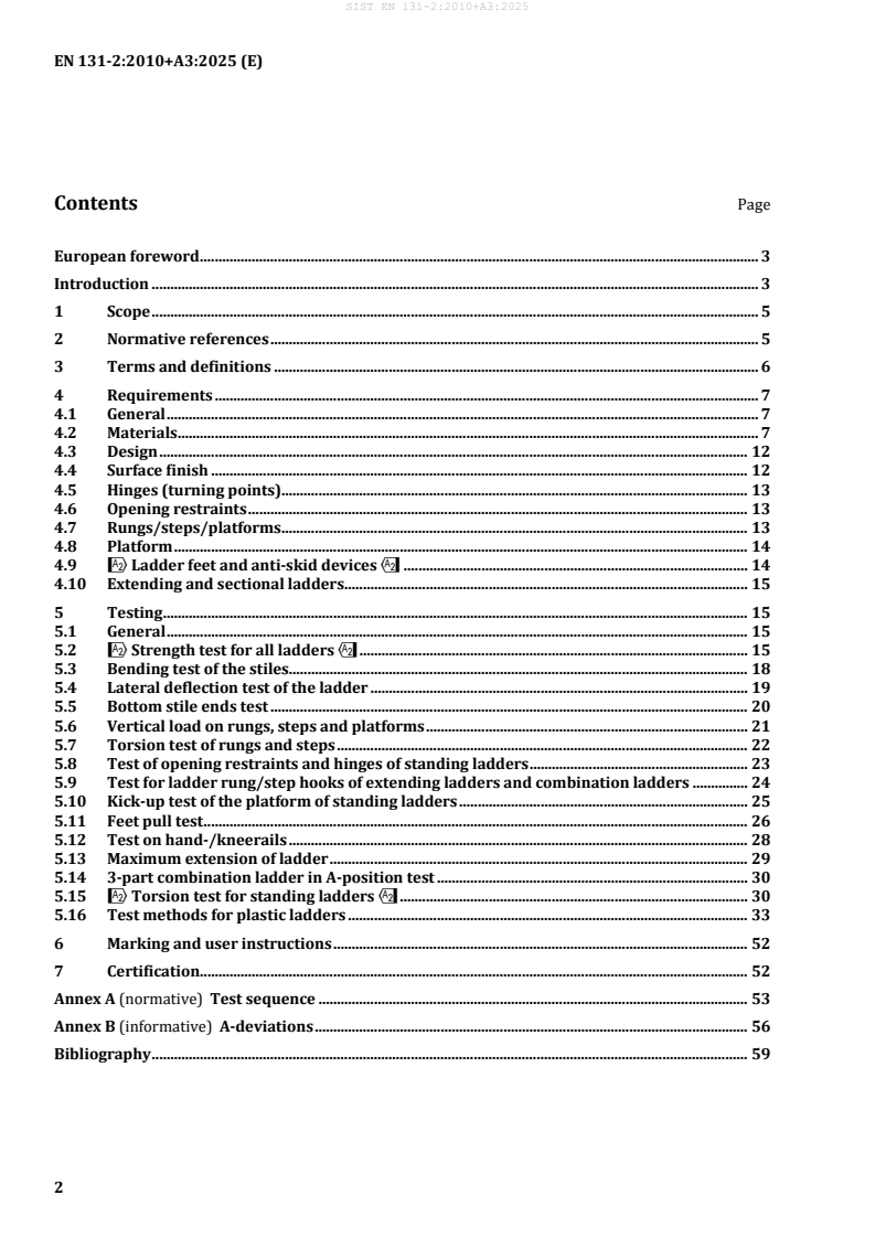 SIST EN 131-2:2010+A3:2025 is a standard published by the Slovenian Institute for Standardization (SIST). Its full title is "Ladders - Part 2: Requirements, testing, marking". This standard covers: This European Standard specifies the general design features, requirements and test methods for portable ladders. It does not apply to step stools or ladders for specific professional use such as firebrigade ladders, roof ladders and mobile ladders. It does not apply to ladders used for work on or near live electrical systems or installations. For this purpose EN 61478 applies. NOTE For insulating ladders for use on or near low voltage electrical installations EN 50528 applies. This European Standard is intended to be used in conjunction with EN 131-1. For single or multiple hinge joint ladders EN 131-4 applies. For telescopic ladders EN 131-6 applies. For mobile ladders with a platform EN 131-7 applies.