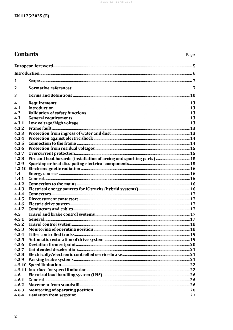 SIST EN 1175:2026 is a standard published by the Slovenian Institute for Standardization (SIST). Its full title is "Safety of industrial trucks - Electrical/electronic requirements". This standard covers: This document specifies the electrical requirements for the design and construction of the electrical installation in self-propelled industrial trucks that are within the scope of ISO 5053-1:2020, except rough-terrain variable-reach trucks as defined in ISO 5053-1:2020, 3.21 and 3.22, straddle carriers as defined in ISO 5053-1:2020, 3.18 and 3.19, and all those functions utilized for the automatic operation of driverless industrial trucks as defined in ISO 5053-1:2020, 3.32. It provides the electrical/electronic and safety-related parts of control system requirements for those self-propelled industrial trucks identified above. NOTE 1 For detailed information about the electrical/electronic requirements for driverless trucks see EN ISO 3691-4:2023, 4.1.3. NOTE 2 Reference is made to this document in other standards which cover the non-electrical requirements of the various industrial truck types. This document deals with safety requirements for all electrical and electronic components of industrial trucks, including electrically actuated hydraulic/pneumatic valves. It specifies minimum performance levels required for safety functions realized by safety related parts of control systems. It is intended to be used to avoid or minimize hazards or hazardous situations listed in Annex I. These situations can arise during the operation in the area of use for which it is designed and during maintenance of trucks in accordance with the specifications and instruction given by the manufacturer. This document does not deal with hazards which could occur: - during construction; - when operating in potentially explosive atmospheres; - because of malfunction of non-electric safety-related parts of control systems, e.g. hydraulic and pneumatic elements like pistons, non-electric valves, pumps, etc.; - when operating outside the range of 30 % to 95 % (not condensing) of relative humidity. NOTE 3 The level of the defined required performance for electrical safety related control systems can be used as a guideline to determine the performance of non-electric systems. NOTE 4 Hazards due to penetration of water and dust are covered by the definition of PLr of safety functions, according to EN ISO 13849-1:2023. NOTE 5 Safety measures outside the scope of the electrical/electronic system are covered by other safety standards e.g. EN ISO 3691 series and EN 16307 series.
