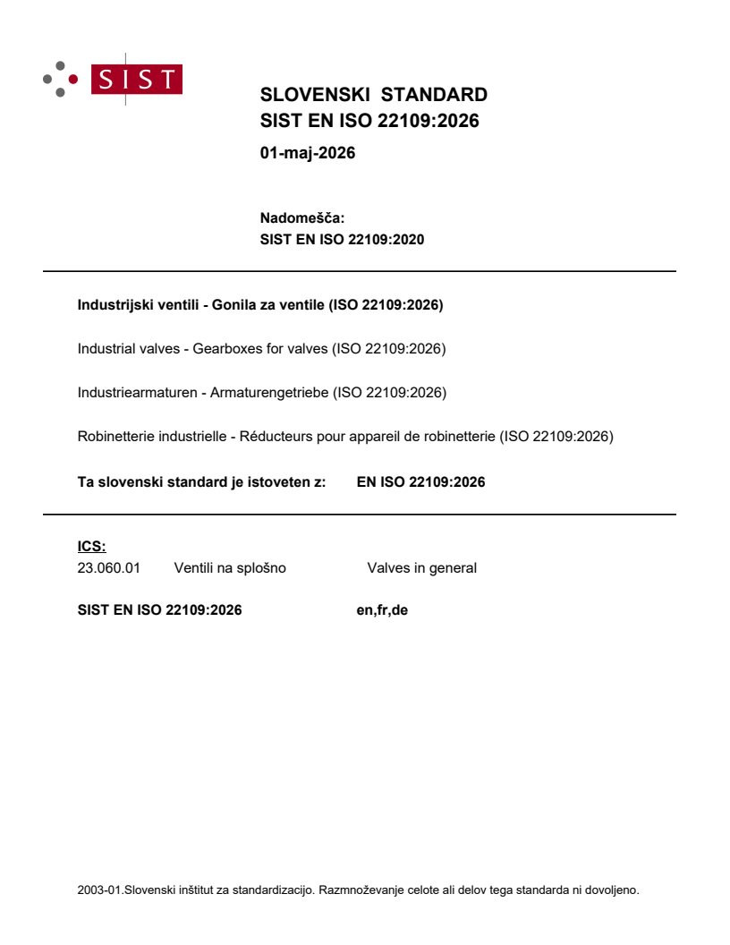 SIST EN ISO 22109:2026 is a standard published by the Slovenian Institute for Standardization (SIST). Its full title is "Industrial valves - Gearboxes for valves (ISO 22109:2026)". This standard covers: This document specifies basic requirements for gearboxes to operate industrial valves for manual and automated on/off and modulating duties, including manual override gearboxes. It includes guidelines for classification, design and methods for conformity assessment. This document does not cover gear systems which are an integral part in the design of valves and subsea gearboxes. Other requirements or conditions of use different from those indicated in this document are agreed between the purchaser and the manufacturer or supplier (first party) prior to order.