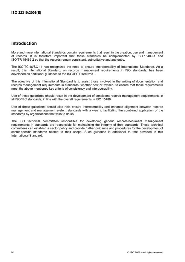 ISO 22310:2006 allows the appropriate incorporation of records requirements, according to ISO 15489-1, ISO/TR 15489-2 and 23081-1, which are applicable to all standards that require the creation and retention of records, into other standards. It also highlights the different elements that need to be considered as components of a comprehensive records management framework. This guidance is in addition to the procedures for technical work and the methodology for the development of International Standards established by the ISO/IEC Directives. ISO 22310:2006 is intended for use by all ISO bodies involved in the development of records management or documentation requirements in standards. It can also be used by non-ISO standards development organizations at the international, regional or national level, which are considering or are in the process of developing records management requirements in standards and/or comparable documents.