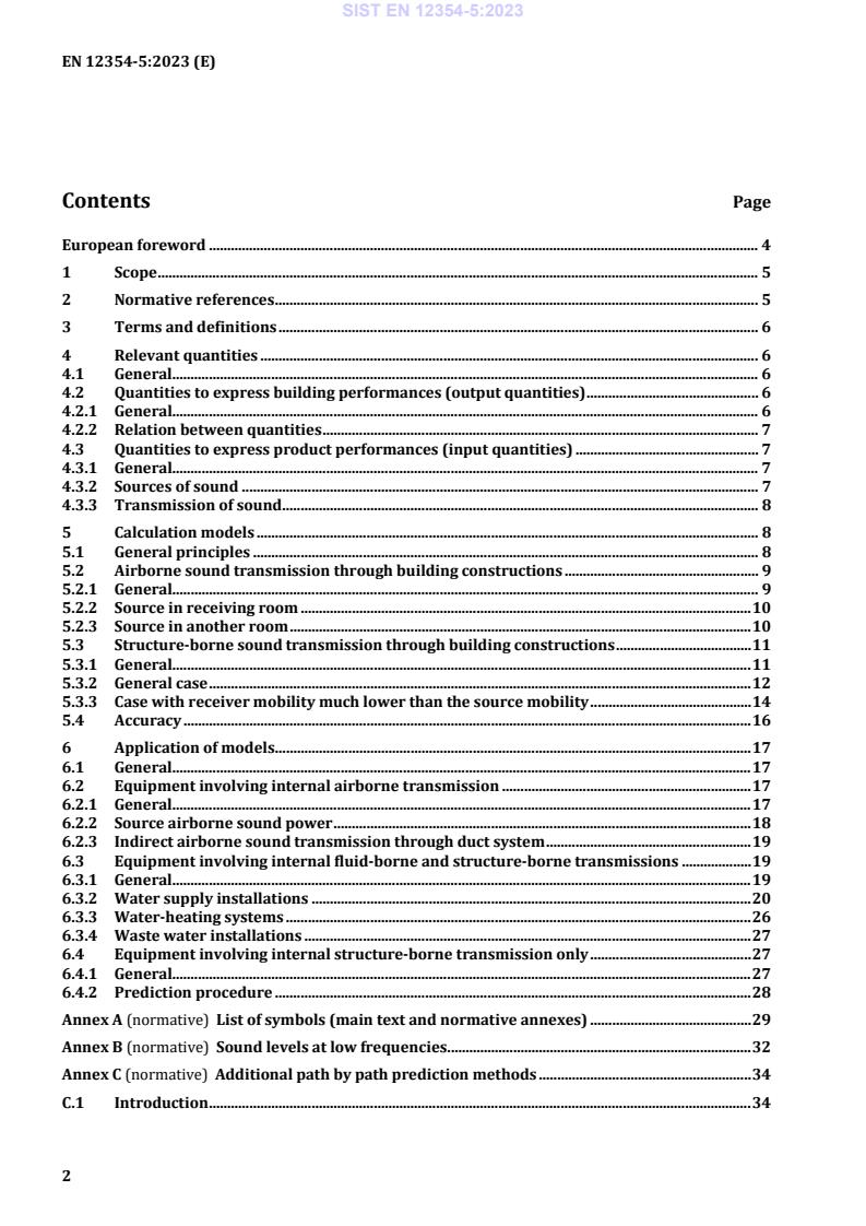 Ta dokument opisuje računske modele za izračun ravni zvočnega tlaka v stavbah zaradi obratovalne opreme. Kot dokument iz dveh dokumentov, ki obravnavata meritve na terenu (EN ISO 16032 za inženirsko metodo in EN ISO 10052 za informativno metodo), se nanaša na sanitarne inštalacije, mehansko prezračevanje, ogrevanje in hlajenje, obratovalno opremo, dvigala, jaške za smeti, kotle, ventilatorje, črpalke in drugo pomožno obratovalno opremo ter parkirna vrata na mehaniziran pogon za avtomobile, vendar se lahko uporablja tudi za drugo pritrjeno ali vgrajeno opremo v stavbi. Računanje običajno temelji na merskih podatkih, ki so značilni tako za opremo (vir) kot za prenos zvoka skozi stavbo. Isto opremo lahko sestavljajo različni viri zvoka v zraku in/ali konstrukcijah na različnih mestih znotraj stavbe. Ta standard vsebuje nekatere informacije o teh virih in določevanju njihovih značilnosti, vendar njegovo področje uporabe ne zajema modelov same opreme.