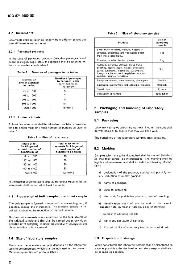 - Prescribed sample sizes: The standard includes tables that define the number of packages or total mass of increments required depending on lot size and product type (examples provided for packaged and bulk produce and for bulky items where pieces are counted).