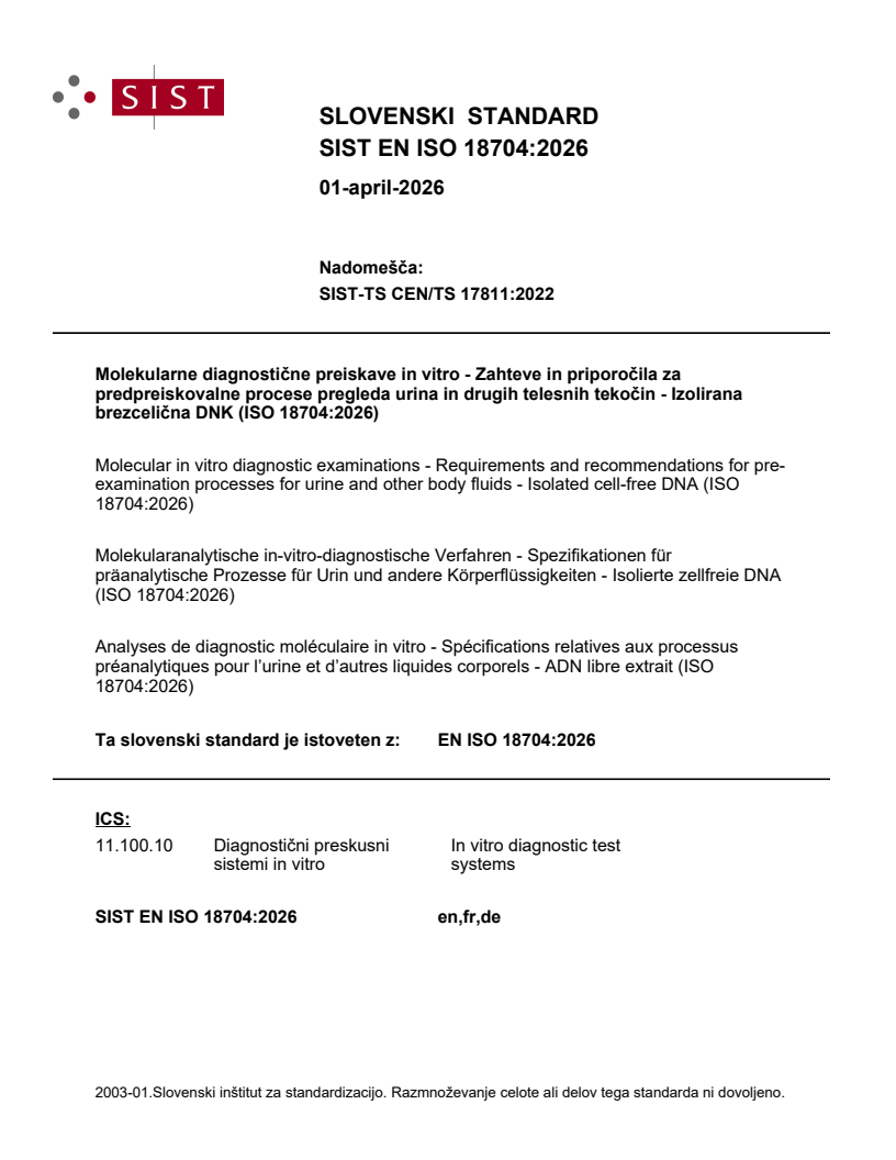 SIST EN ISO 18704:2026 is a standard published by the Slovenian Institute for Standardization (SIST). Its full title is "Molecular in vitro diagnostic examinations - Requirements and recommendations for pre-examination processes for urine and other body fluids - Isolated cell-free DNA (ISO 18704:2026)". This standard covers: This document specifies requirements and provides recommendations for the pre-examination process of cell-free DNA (cfDNA) from body fluid specimens other than blood, including but not limited to the collection, handling, storage, transport, processing and documentation of human body fluids, such as urine, pleural effusions, ascites, cerebrospinal fluid (CSF), and saliva, intended for cfDNA examination. Processing includes multiple steps, such as centrifugation for specimen purification and isolation of cfDNA. This document does not cover dedicated measures for cytohistological analysis of nucleated cells derived from body fluid, nor measures for preserving and handling of pathogens, and other bacterial or whole microbiome DNA in body fluids described. Dedicated measures for preserving circulating cell-free DNA (ccfDNA) from blood are covered in ISO 20186-3. This document is applicable to medical laboratories, health institutions including facilities collecting and handling specimens, laboratory customers, in vitro diagnostic examination developers and manufacturers, biobanks, institutions and organizations performing biomedical research, and regulatory authorities. NOTE International, national or regional regulations or requirements can also apply to specific topics covered in this document.