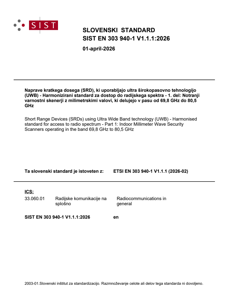 SIST EN 303 940-1 V1.1.1:2026 is a standard published by the Slovenian Institute for Standardization (SIST). Its full title is "Short Range Devices (SRDs) using Ultra Wide Band technology (UWB) - Harmonised standard for access to radio spectrum - Part 1: Indoor Millimeter Wave Security Scanners operating in the band 69,8 GHz to 80,5 GHz". This standard covers: The present document specifies technical requirements, limits and test methods for Millimeter Wave Security Scanners (mmWave SSC, SSC equipment) operating indoor in the band 69,8 GHz to 80,5 GHz. The operating frequency range is split into two bands 97 from 69,8 GHz to 79,9 GHz and 99 from 76,5 GHz to 80,5 GHz as defined in Decision (EU) 2025/105 [i.8]. Details on mmWave SSC equipment and the related categorization is further specified in clause 4.2. NOTE: The relationship between the present document and essential requirements of article 3.2 of Directive 2014/53/EU [i.1] is given in annex A.