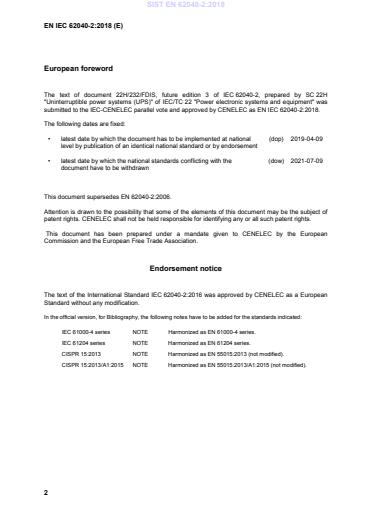 This document supersedes EN 62040-2:2006. Attention is drawn to the possibility that some of the elements of this document may be the subject of patent rights. CENELEC shall not be held responsible for identifying any or all such patent rights.