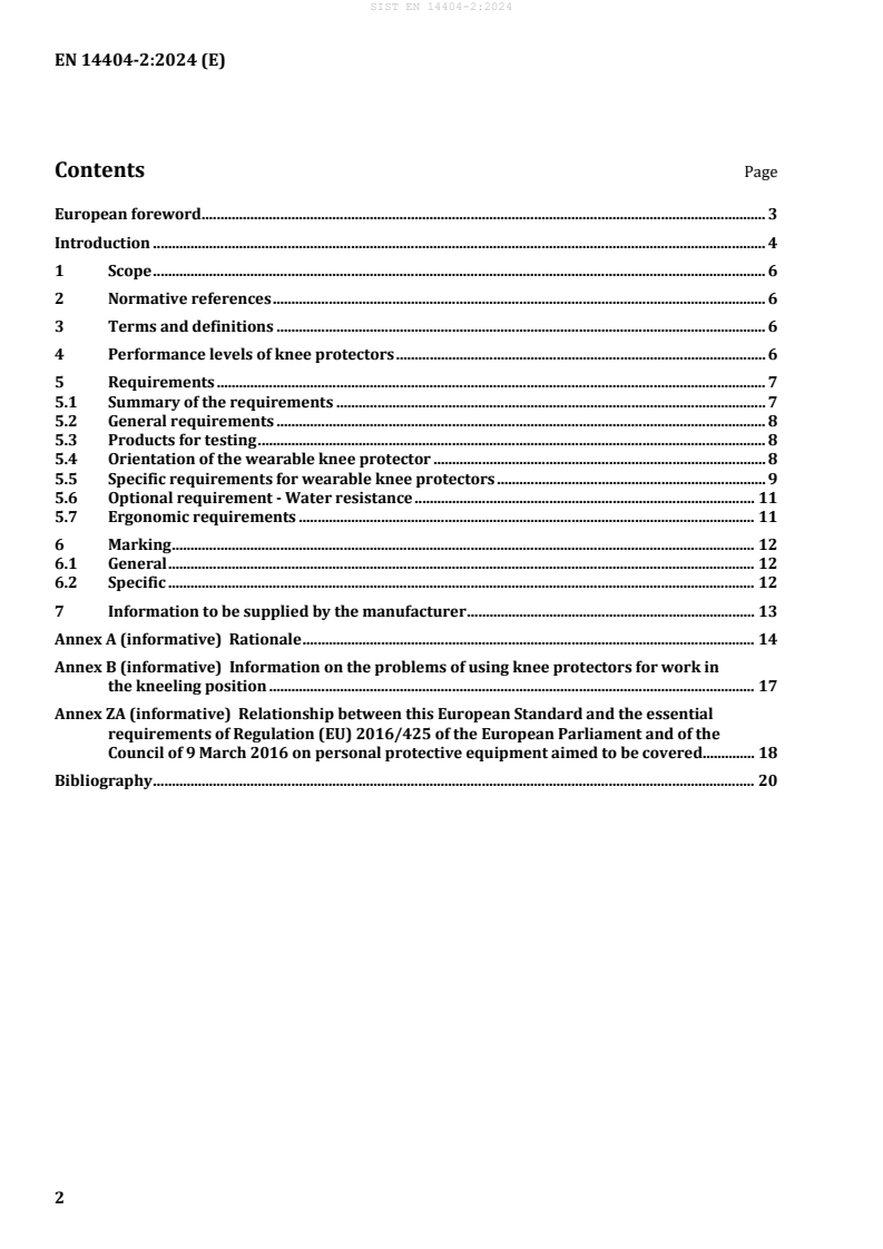 EN 14404-2:2024 is the CEN standard that defines requirements and performance levels for wearable knee protectors (type 1) intended for work in the kneeling position. It specifies design, marking and manufacturer information requirements to reduce knee injuries from continuous pressure and penetration while kneeling. This Part 2 standard works with EN 14404-1:2024 (test methods) and references EN ISO 13688 for innocuousness and general protective clothing requirements. It does not apply to medical devices, sports or motorcycle knee protectors.
