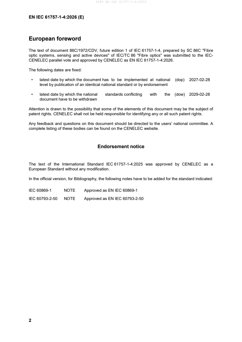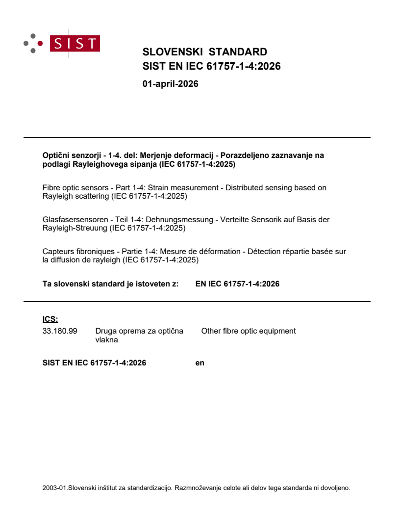 SIST EN IEC 61757-1-4:2026 is a standard published by the Slovenian Institute for Standardization (SIST). Its full title is "Fibre optic sensors - Part 1-4: Strain measurement - Distributed sensing based on Rayleigh scattering (IEC 61757-1-4:2025)". This standard covers: IEC 61757-1-4:2025 defines the terminology, structure, and measurement methods of distributed fibre optic sensors for absolute strain measurements based on spectral correlation analysis of Rayleigh backscattering signatures in single-mode fibres, where the fibre is the distributed strain measurement element in a measurement range from about 10 m to tens of km. This document also applies to hybrid sensor systems that combine the advantages of Brillouin and Rayleigh backscattering effects to obtain optimal measurement quality. This document also specifies the most important features and performance parameters of these distributed fibre optic strain sensors defines procedures for measuring these features and parameters. This part of IEC 61757 does not apply to point measurements or to dynamic strain measurements. Distributed strain measurements using Brillouin scattering in single-mode fibres are covered in IEC 61757-1-2. The most relevant applications of this strain measurement technique are listed in Annex A, while Annex B provides a short description of the underlying measurement principle.