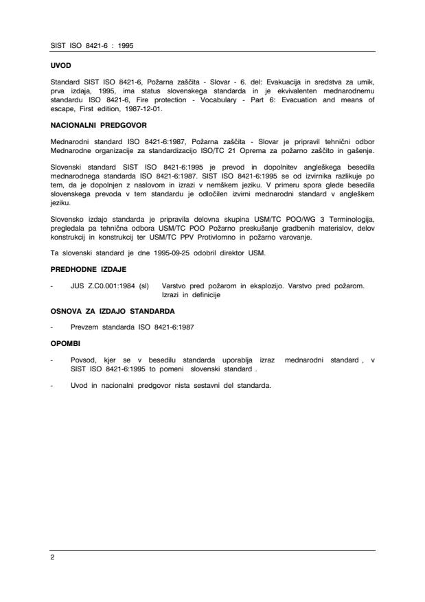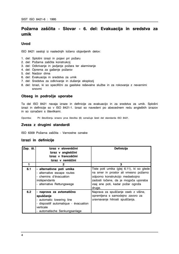SIST ISO 8421-6:1995 is a standard published by the Slovenian Institute for Standardization (SIST). Its full title is "Fire protection -- Vocabulary -- Part 6: Evacuation and means of escape". This standard covers: Concepts are given in English in alphabetical order. A French index is provided. General use terms are covered by ISO 8421-1.