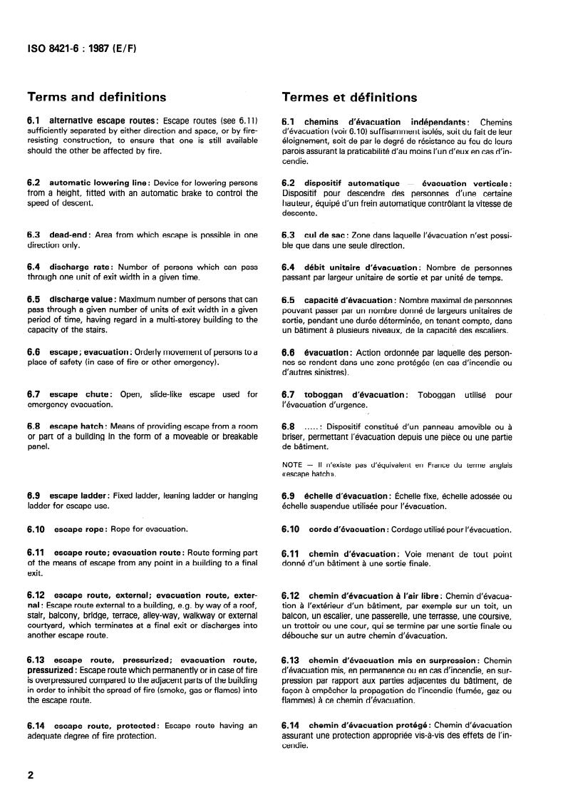 ISO 8421-6:1987 - Fire protection - Vocabulary - Part 6: Evacuation and means of escape is an International Standard that defines terminology related to evacuation, escape routes and emergency egress. Prepared by ISO/TC 21 (Equipment for fire protection and fire fighting), this part provides precise English-language terms (alphabetically arranged) with a French index. General-use fire terms are covered in ISO 8421‑1. The standard standardizes language used by designers, safety professionals and regulators to reduce ambiguity in fire‑safety planning and documentation.
