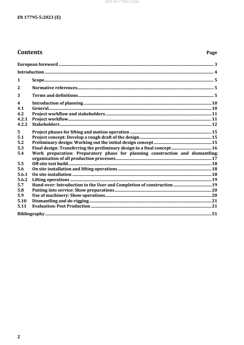 SIST EN 17795-5:2024 is a standard published by the Slovenian Institute for Standardization (SIST). Its full title is "Entertainment technology - Codes of Practice - Part 5: Lifting and motion operations in the event industry". This standard covers: This code of practice provides a set of guidelines for lifting and motion operations related to machinery and machinery installations used in staging and production facilities for events. This document is pertinent to all the machinery phases, assembly, commissioning, setting, operation and dismantling employed in the event industry including machinery defined in point j, Article 1.2 of the Machinery Directive (2006/42/EC): "machinery intended to move performers during artistic performances". This document also applies to machinery and machinery installations based on new technologies or specially designed installations which are not expressly mentioned here but which nevertheless operate in a similar manner or are meant for similar purposes to those listed above. This document does not provide specific details but is intended to provide general guidelines on planning and the process of lifting and motion operations.