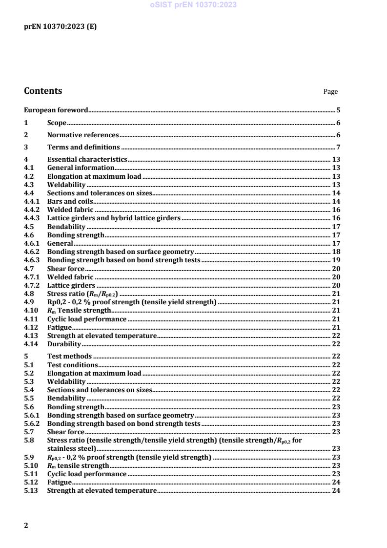 oSIST prEN 10370:2023 is a draft published by the Slovenian Institute for Standardization (SIST). Its full title is "Steel for the reinforcement of concrete - Stainless steel". This standard covers: This document specifies product characteristic test/assessment method and the way of expressing test results for stainless steel as defined in EN 10088-1:2014 and designated as in EN 10088-1:2014 for the use of the reinforcement of concrete. It applies to stainless steel products with ribbed or indented surfaces, which are in the form of: - bars and coils (rod, wire); - sheets of factory-made machine-welded fabric; - lattice girders and hybrid lattice girders composed by stainless steel and by weldable reinforcing steel according to prEN 10080:2023. Steels according to this document have a ribbed, indented or smooth surface. NOTE The protrusions between indentations of indented reinforcing steel have the same function as transverse ribs of ribbed reinforcing steel. There is no definition, which specifies the difference between ribbed and indented surface geometry. Therefore, in this document, the same bond parameters are used for ribbed and indented steel. This document does not apply to: - pre-stressed stainless steels; - indented strip; - stainless steel tube filled with carbon steel swarf, which is then hot or cold reduced; - stainless steel smooth bar with weld material deposited on it; - galvanized reinforcing steel; - epoxy-coated reinforcing steel.