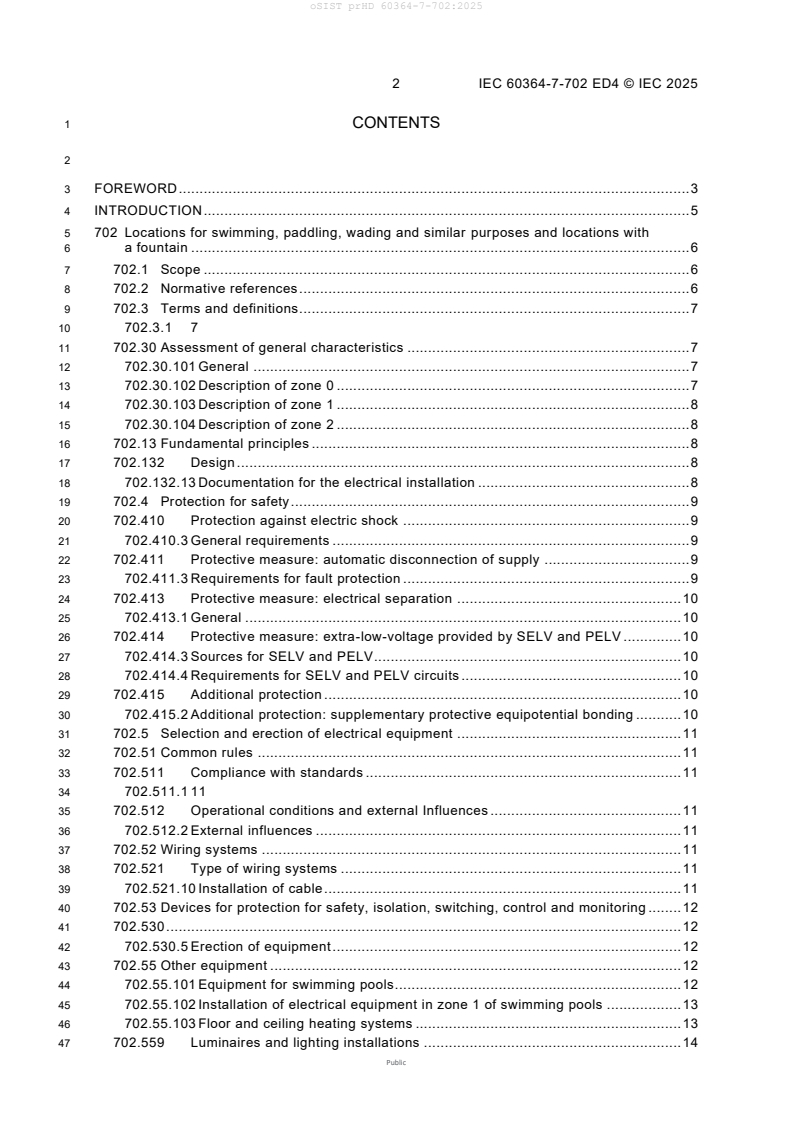 prHD 60364-7-702:2025 (based on IEC 60364-7-702 ED4) sets out requirements for low-voltage electrical installations in locations for swimming, paddling, wading and for locations with fountains. This committee draft addresses safe design, installation, operation and documentation for electrical equipment in the presence of water. The standard supplements the general parts of IEC 60364 and concentrates on site-specific hazards and protective measures relevant to pools, hot tubs, fountains and similar water features.