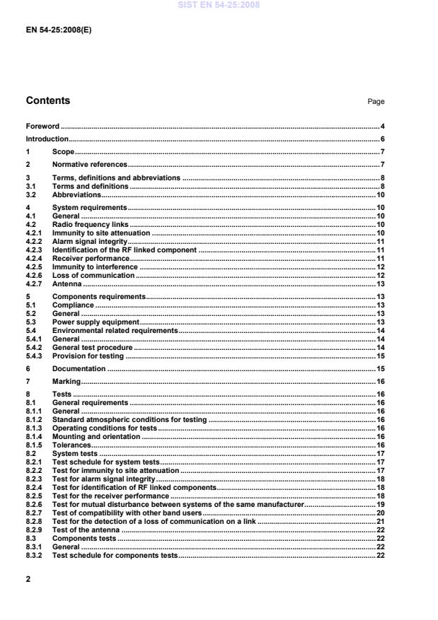 SIST EN 54-25:2008 is a standard published by the Slovenian Institute for Standardization (SIST). Its full title is "Fire detection and fire alarm systems - Part 25: Components using radio links". This standard covers: This European Standard specifies requirements, test methods and performance criteria for components used in fire alarms systems, installed in and around buildings, which use radio frequency links (RF links) to communicate. It also provides requirements for the evaluation of conformity of the components to the requirements of this European Standard. Where components work together and this requires knowledge of the system design, this document also specifies requirements on the system. When the fire detection and fire alarm systems (FDAS) use wired and RF links, the relevant parts of EN 54 apply together with this document. Requirements relevant to wire links are superseded or modified by those included in this European Standard. This document does not restrict:  the intended use of radio spectrum, e.g. frequency, power output of devices;  the allowed maximum number of the components using RF links within the FDAS or one transmission path and/or RF link;  the allowed maximum number of the components affected by loss of one transmission path and/or RF link. These requirements relate to national regulations and can vary from member state to member state.