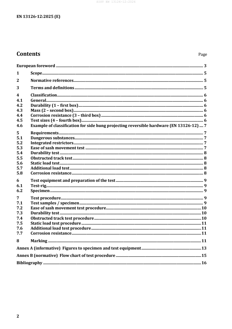 Keywords: EN 13126-12:2025, side hung projecting reversible hardware, windows hardware, durability test, corrosion resistance, sash mass, test methods, CEN, building hardware.