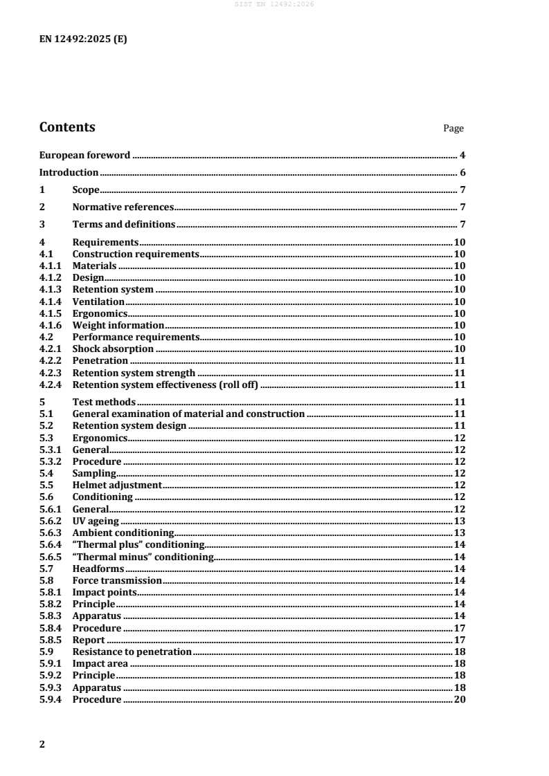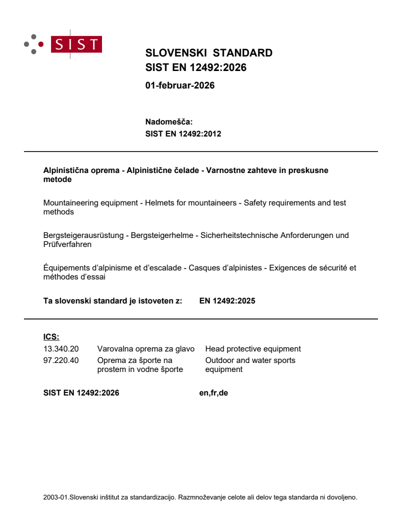 SIST EN 12492:2026 is a standard published by the Slovenian Institute for Standardization (SIST). Its full title is "Mountaineering equipment - Helmets for mountaineers - Safety requirements and test methods". This standard covers: This document specifies requirements and test methods for protective helmets for use in mountaineering intended to protect the head of the user in order to reduce the risk of impact injury. This document is also applicable to protective helmets used in activities with similar hazards as in mountaineering, including, but not limited to, climbing, caving, canyoning, rope courses and via ferrata climbing. This document does not apply to protective helmets used by ski mountaineers as defined in EN 18100:2025.
