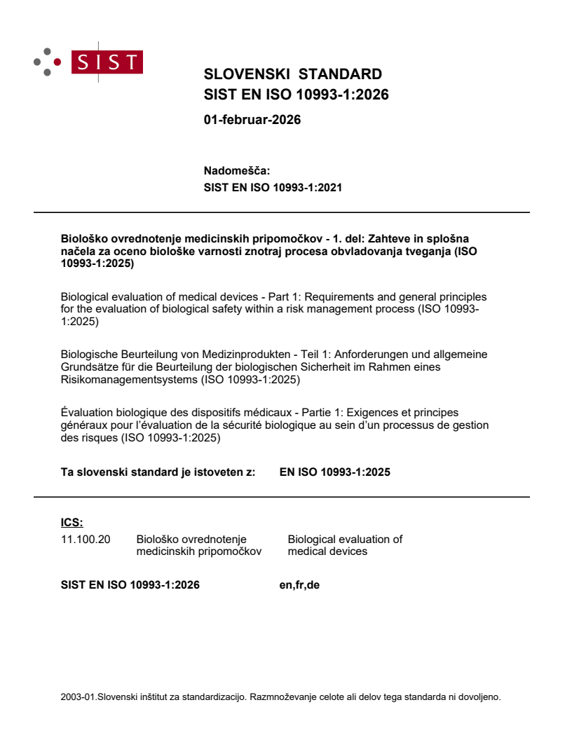 SIST EN ISO 10993-1:2026 is a standard published by the Slovenian Institute for Standardization (SIST). Its full title is "Biological evaluation of medical devices - Part 1: Requirements and general principles for the evaluation of biological safety within a risk management process (ISO 10993-1:2025)". This standard covers: This document specifies the requirements and general principles governing the biological evaluation of medical devices within a risk management process according to ISO 14971. This document applies to the biological evaluation of medical devices that have direct contact or indirect contact with either: — a patient's body during intended use or reasonably foreseeable misuse; or — the body of other users who are not patients, if the medical device is intended for personal protection (e.g. medical gloves, surgical masks). Biological evaluation assesses the biological safety of the medical device by considering the biological risks associated with: — constituents of a medical device; and — tissue-device interactions (including physical effects). The biological evaluation specified in this document can address the biological safety of the medical device, considering the life cycle from design and development through initial use of the finished medical device to final decommissioning or withdrawal from use. The biological evaluation considers both the biological safety of the finished device in first use, and the significance of any changes to the medical device which can occur throughout the life cycle. However, the evaluation of risks related to environmental impacts of decommissioning of medical devices are not within the scope of this document. This document does not mandate re-testing of medical devices that are already on the market and have established and acceptable safety profiles (see 6.6.2). This document can be useful to support clinical or usability evaluations of medical devices. For example, a biological evaluation is a pre-requisite for conducting a clinical trial. This means that principles outlined in this document can be applied to the evaluation of prototype or development stage devices, as well as to finished medical devices. Other parts of the ISO 10993 series cover specific aspects of biological evaluation, such as chemical characterization, biological testing, sample preparation, animal welfare and toxicological risk assessment. For some types of medical devices, specific requirements from other standards (outside the ISO 10993 series) can be considered with a justification for the approach taken if there are differences between the requirements of the ISO 10993 series and those provided in other standards. For example, the ISO 18562 series provides specific requirements for biological evaluation of breathing gas pathway medical devices and ISO 7405 provides specific requirements for biological evaluation of dental devices. The evaluation of risks related to infectious agents [e.g. bacteria, moulds, yeasts, viruses, transmissible spongiform encephalopathy (TSE) agents] is not within the scope of this document. NOTE 1 The evaluation of bacterial endotoxins is addressed by ISO 11737-3. NOTE 2 The evaluation of risks related to viruses, TSE agents and other pathogens originating from materials of animal origin is addressed by the ISO 22442 series.