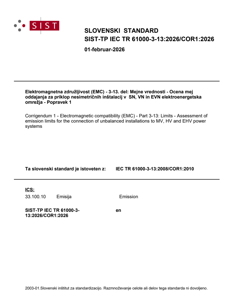 SIST-TP IEC TR 61000-3-13:2026/COR1:2026 is a corrigendum published by the Slovenian Institute for Standardization (SIST). Its full title is "Corrigendum 1 - Electromagnetic compatibility (EMC) - Part 3-13: Limits - Assessment of emission limits for the connection of unbalanced installations to MV, HV and EHV power systems". This standard covers: Subscribe to <a href='http://webstore.iec.ch/webstore/webstore.nsf/Artnum_PK/34192?opendocument'>IEC 60061 Database</a> to access the full and updated content of the series.