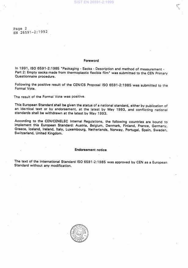 Keywords: EN 26591-2:1992, ISO 6591-2:1985, packaging, sacks, plastic sacks, thermoplastic flexible film, dimensions, method of measurement, sampling, test report.