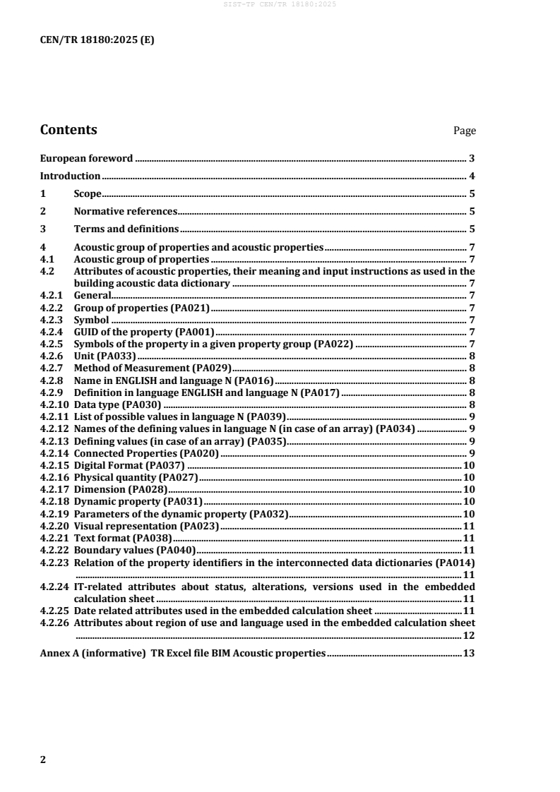 CEN/TR 18180:2025 - Building Acoustics: Data Dictionary (CEN) provides a standardized, machine‑readable catalogue of building acoustic properties to be used in digital workflows and BIM. Based on the attribute methodology of EN ISO 23386:2020, the technical report defines a core set of acoustic properties and their attributes (GUIDs, names, units, measurement methods, data types, connected properties, etc.) and supplies an annexed calculation sheet / Excel file with the property list for mapping and exchange between databases.