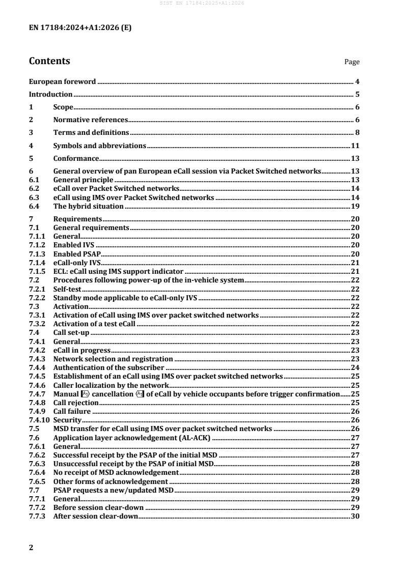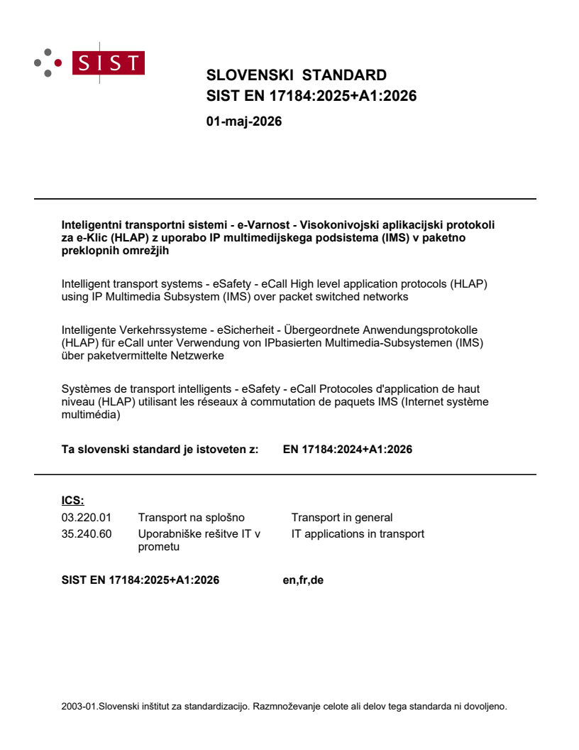 SIST EN 17184:2025+A1:2026 is a standard published by the Slovenian Institute for Standardization (SIST). Its full title is "Intelligent transport systems - eSafety - eCall High level application protocols (HLAP) using IP Multimedia Subsystem (IMS) over packet switched networks". This standard covers: In respect of pan European eCall (operating requirements defined in EN 16072), this document defines the high level application protocols, procedures and processes required to provide the eCall service via a packet switched wireless communications network using IMS (IP Multimedia Subsystem) and wireless access (such as LTE, NR and their successors). This document assumes support of eCall using IMS over packet switched networks by an IVS and a PSAP and further assumes that all PLMNs available to an IVS at the time an eCall or test eCall is initiated are packet switched networks. Support of eCall where eCall using IMS over packet switched networks is not supported by an IVS or PSAP is out of scope of this document. At some moment in time packet switched networks will be the only Public Land Mobile Networks (PLMN) available. However as long as GSM/UMTS PLMNs are available (Teleservice 12/TS12) ETSI TS 122 003 will remain operational. Both the use of such PLMNs and the logic behind choosing the appropriate network in a hybrid situation (where both packet-switched and circuit-switched networks are available) are out of scope of this document. NOTE 1 The objective of implementing the pan-European in-vehicle emergency call system (eCall) is to automate the notification of a traffic accident, wherever in Europe, with the same technical standards and the same quality of services objectives by using a PLMN (such as ETSI prime medium) which supports the European harmonized 112/E112 emergency number (TS12 ETSI TS 122 003 or IMS packet switched network) and to provide a means of manually triggering the notification of an emergency incident. NOTE 2 HLAP requirements for third party services supporting eCall can be found in EN 16102. This document makes reference to those provisions but does not duplicate them.